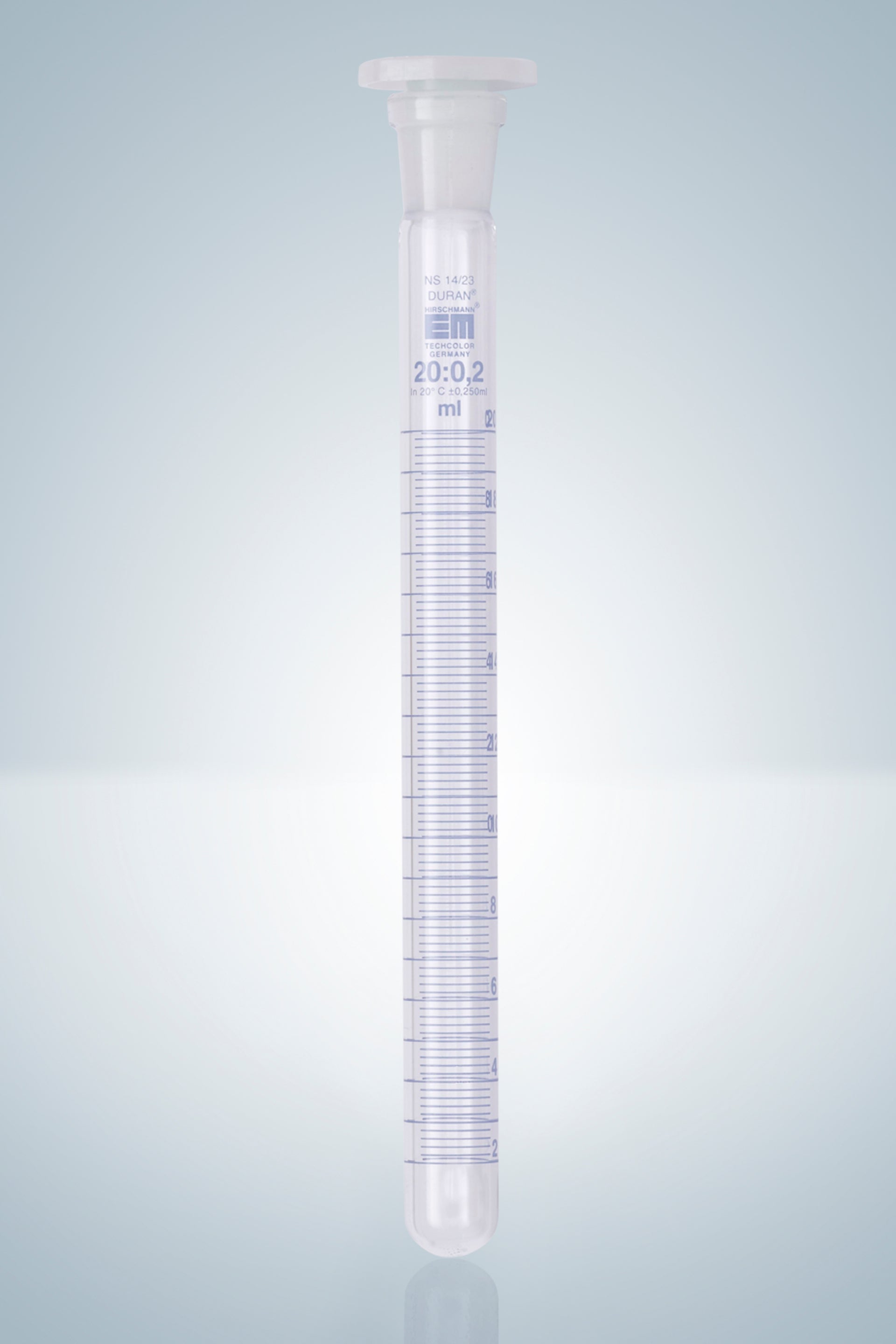 Test tubes DURAN®, blue graduation, 10:0,1 ml, NS 12/21, L 170 mm, OD 14 mm, NS-ground and Polyethylene stopper.