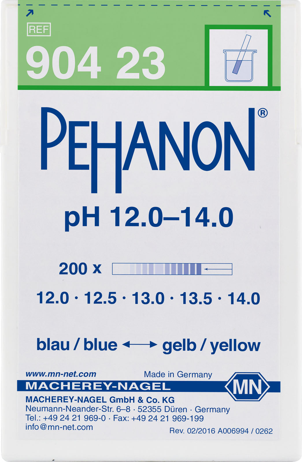 - pH test strips, PEHANON 12.0–14.0, for colored samples
