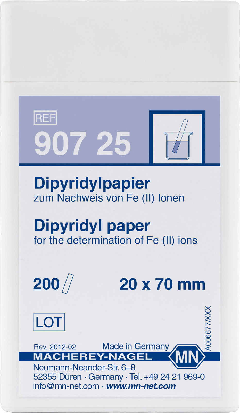 Dipyridyl paper allows the sensitive and specific detection of Fe(II) ions. Even small amounts of Fe(II) can safely be detected in presence of large amounts of Fe(III).