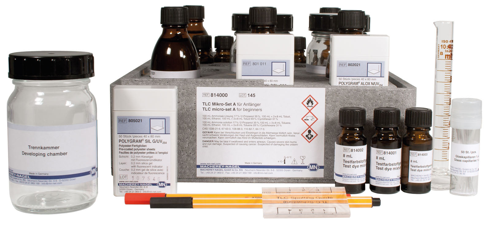 TLC Micro-Set A for beginners. This Micro-Set A contains all chemicals and accessories for the following experiments - Separation of a mixture of fat-soluble / lipophilic dyes (test dye mixture 1) - butter yellow, indophenol, sudan blue II, sudan red G ; Separation of a mixture of anthraquinone dyes (test dye mixture 2) - blue 1, blue 3, green, green blue, red, violet 1, violet 2; Separation of a mixture of food dyes (test dye mixture 3) - brilliant black BN (E151), fast red E, erythrosine (E127), yellow orange S (sunset yellow CFC, E110), naphthol red S, ponceau 4 R (E124), tartrazine (E102); Separation of dyes from felt tip pens. This product contain harmful substances which must be specially labeled as hazardous. For detailed information please see SDS.