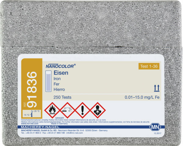 Hazardous material: Yes Shelf life (from production): 1 Year Brand: NANOCOLOR Storage temperature: 15−25 °C Remark: Measuring range on NANOCOLOR VIS II NanOx N: No Crack-Set: No Sludge reagent set: No Sea water analysis: Yes Evaluable on photometer: UV/VIS II Evaluable on photometer: VIS II Evaluable on photometer: 500 D NanOx Metal: No Scope of delivery: Rugged box with reagents for 250 tests. Platform: NANOCOLOR standard tests Parameter: Hydrazine Method: Hydrazine - 4 -(Dimethylamino)benzaldehyde Measuring range: Hydrazine - 0.002–1.50 mg/L N₂H₄ Based on norm: Analogous to DIN 38413 – P1 Test No.: 1-44 -