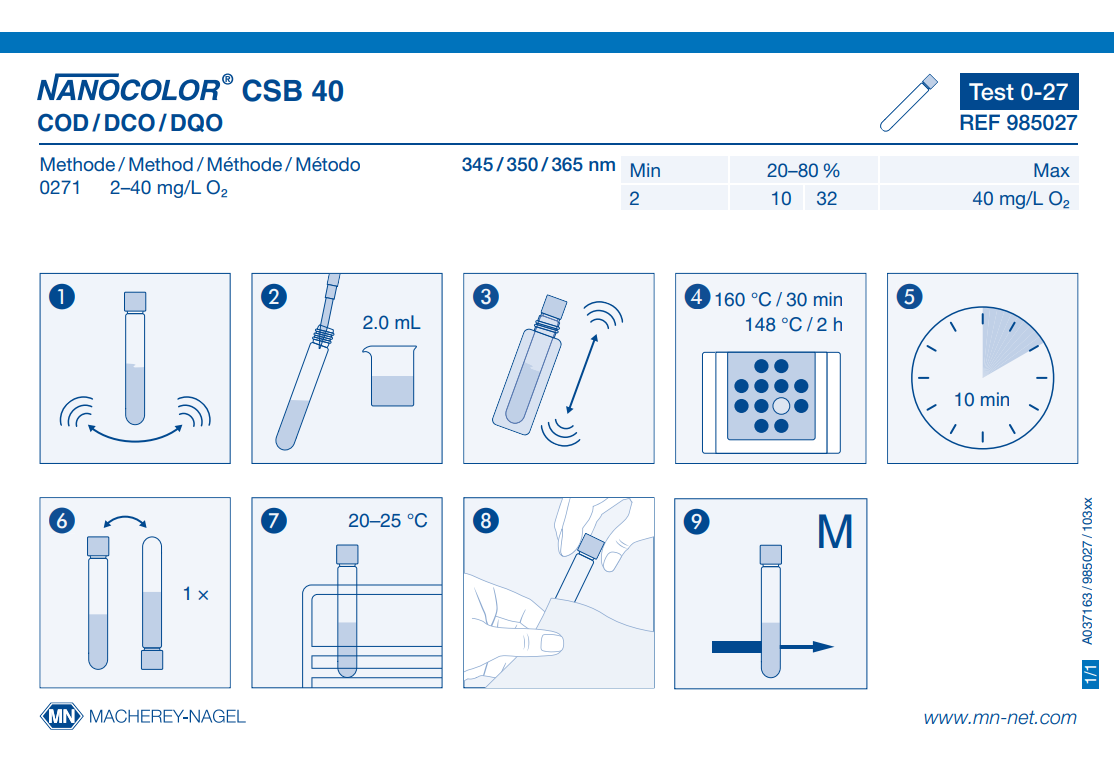 Hazardous material: Yes Shelf life (from production): 1 Year Storage temperature: 2−8 °C Brand: NANOCOLOR Parameter: COD Scope of delivery: Rugged box with 20 test tubes. Sufficient for 20 tests. Remark: Measuring range on NANOCOLOR VIS II Platform: NANOCOLOR tube tests NanOx N: No Crack-Set: No Sludge reagent set: No Evaluable on photometer: UV/VIS II Evaluable on photometer: VIS II Evaluable on photometer: 500 D Evaluable on photometer: PF-12Plus NanOx Metal: No Sea water analysis: No Method: COD - Potassium dichromate Evaluable on photometer: PF-3 COD Based on norm: In accordance with DIN ISO 15705 – H45, analogous to EPA 410.4, APHA 5220 D, DIN 38409 – H41-1 Measuring range: COD - 2–40 mg/L O₂ Test No.: 0-27 -