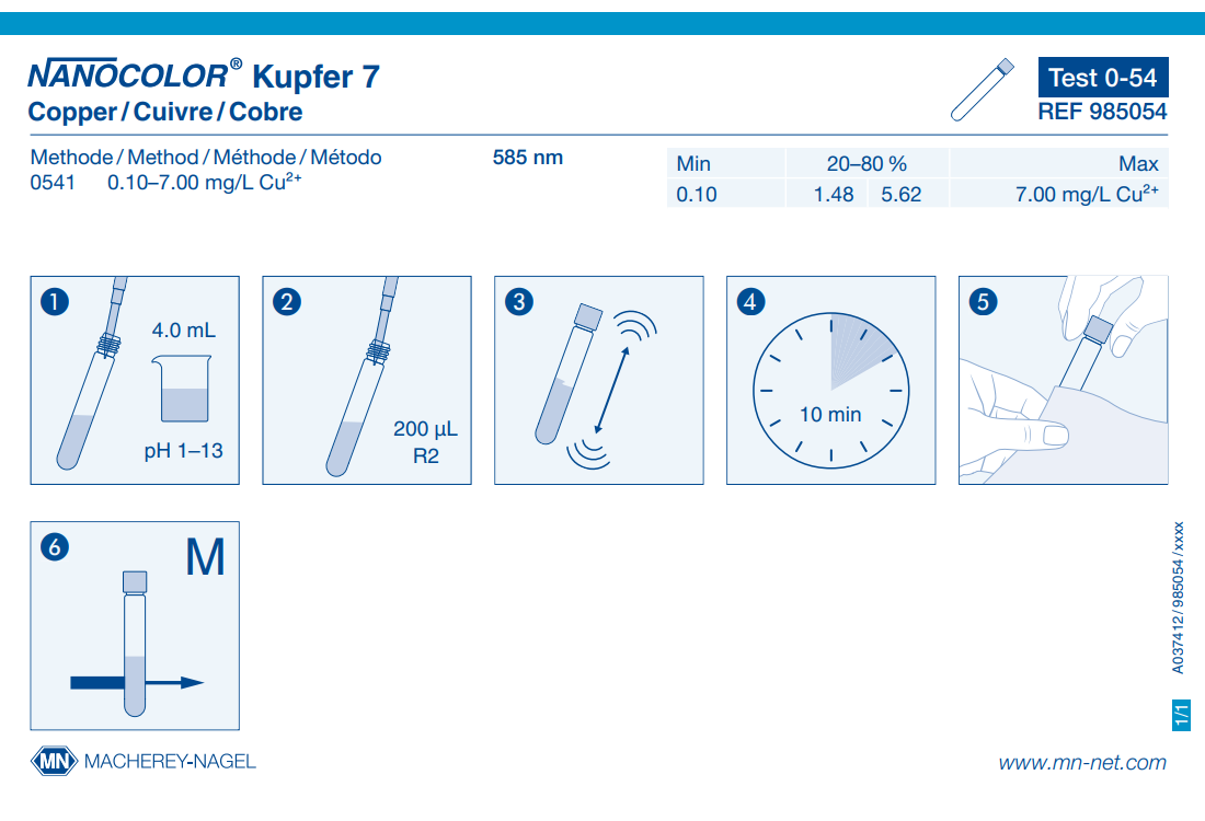 Hazardous material: No Shelf life (from production): 2 Years Parameter: Copper Brand: NANOCOLOR Storage temperature: 15−25 °C Scope of delivery: Rugged box with 20 test tubes. Sufficient for 20 tests. Remark: Measuring range on NANOCOLOR VIS II Platform: NANOCOLOR tube tests NanOx Metal: Yes NanOx N: No Sludge reagent set: No Sea water analysis: Yes Evaluable on photometer: UV/VIS II Evaluable on photometer: VIS II Evaluable on photometer: 500 D Evaluable on photometer: PF-12Plus Crack-Set: Yes Method: Copper - Cuprizone Measuring range: Copper - 0.10–7.00 mg/L Cu²⁺ Test No.: 0-54 -