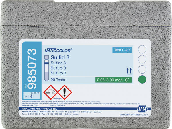 Hazardous material: Yes Shelf life (from production): 3 Years Parameter: Sulfide Brand: NANOCOLOR Storage temperature: 15−25 °C Scope of delivery: Rugged box with 20 test tubes. Sufficient for 20 tests. Remark: Measuring range on NANOCOLOR VIS II Platform: NANOCOLOR tube tests NanOx N: No Crack-Set: No Sludge reagent set: No Sea water analysis: Yes Evaluable on photometer: UV/VIS II Evaluable on photometer: VIS II Evaluable on photometer: 500 D Evaluable on photometer: PF-12Plus NanOx Metal: No Method: Sulfide - Methylene blue Measuring range: Sulfide - 0.05–3.00 mg/L S²⁻ Based on norm: Analogous to DIN 38405 – D26, DIN 38405 –27 Test No.: 0-73 -