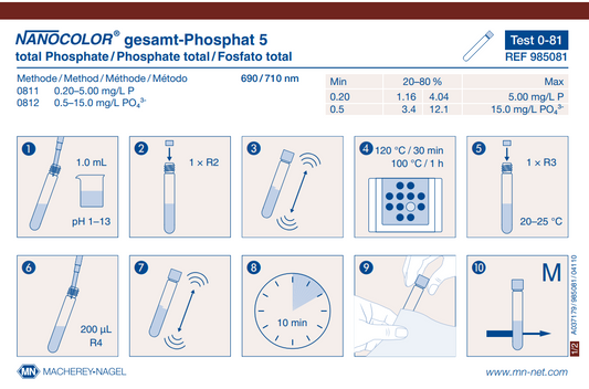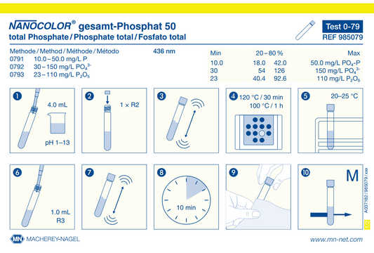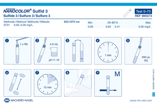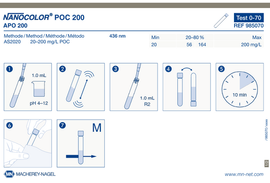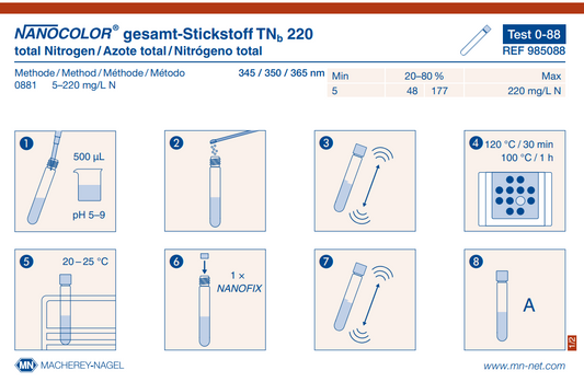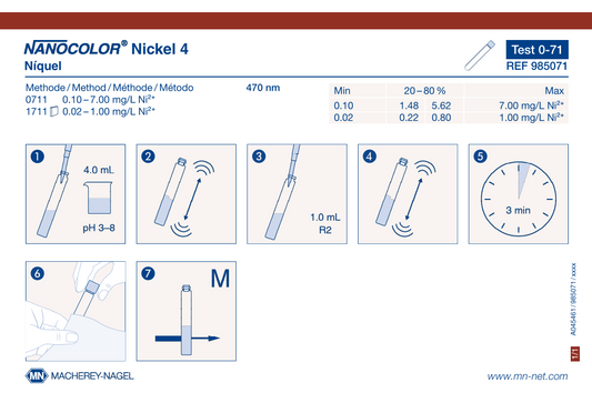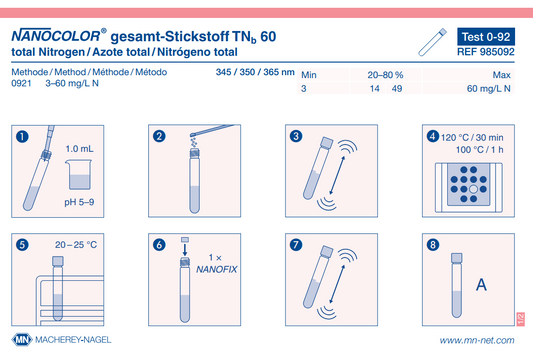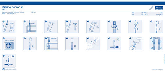 NANOCOLOR tube tests for photometric analysis convince by their easy handling and therefore are the first choice for routine, laboratory and process analysis. A maximum in accuracy and precision is granted for the measurement results due to exactly pre-dosed reagents in 16 mm cuvettes and additional reagents. The tests are pre-programmed in MACHEREY‑NAGEL photometers and selected automatically via a barcode on the cuvette. This perfect interaction of instruments and tests lets the user experience a high measurement safety, saving time and working cost-efficiently.