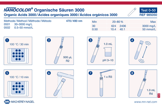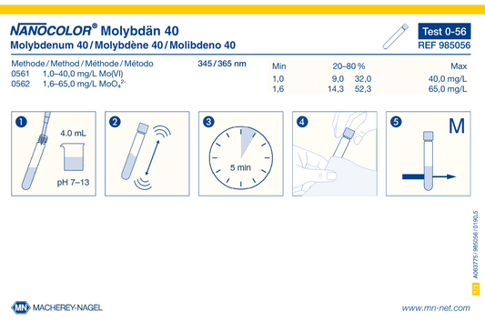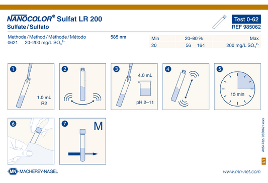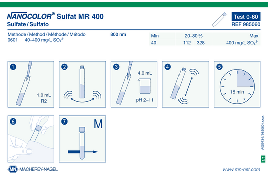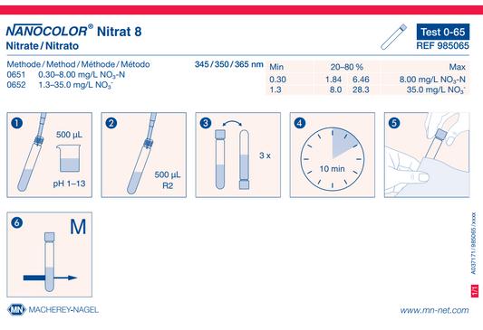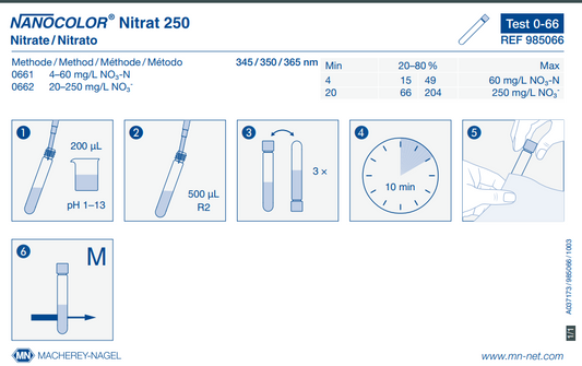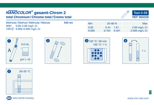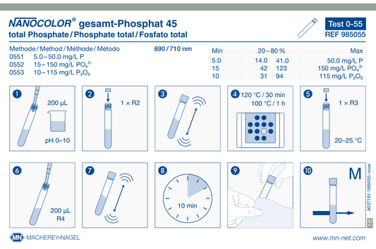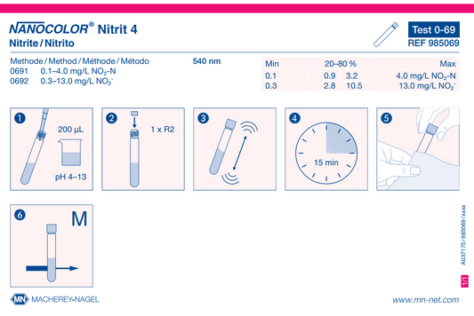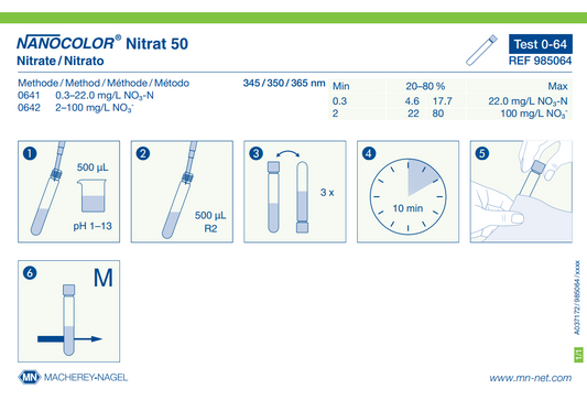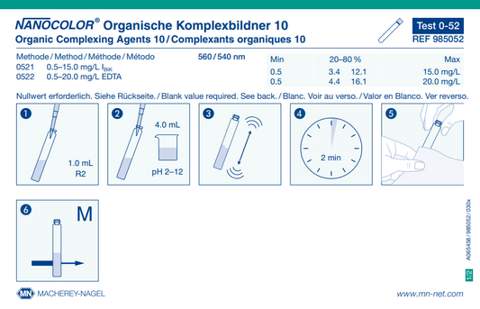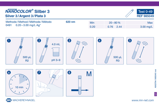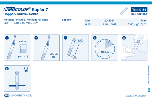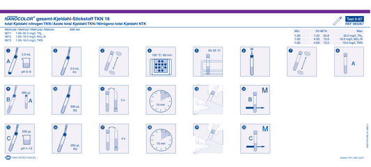 NANOCOLOR tube tests for photometric analysis convince by their easy handling and therefore are the first choice for routine, laboratory and process analysis. A maximum in accuracy and precision is granted for the measurement results due to exactly pre-dosed reagents in 16 mm cuvettes and additional reagents. The tests are pre-programmed in MACHEREY‑NAGEL photometers and selected automatically via a barcode on the cuvette. This perfect interaction of instruments and tests lets the user experience a high measurement safety, saving time and working cost-efficiently.