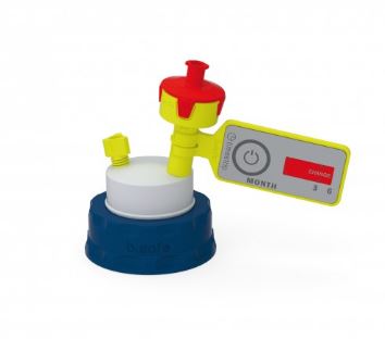 Perfectly matched system for removal of eluents. Tubing can be inserted onto the ground of the bottle by means of the b.safe fittings made of PFA. The conical seal cone clamps the tubing and seals the connection safely. The b.safe Air Valve is especially adapted to the flow rate in HPLC. The integrated non-return valve avoids evaporation of solvents and lets flow ambient air into the bottle in case of vacuum. The upstream porous PTFE membrane restrains pollutant particles and other contaminations from outside. The 6 months service life of the filter can be easily monitored through either activating the display on the cap and exchanging the valve in case of completely red colouring or documentation of the exchange date by hand and clip in the display at the valve.