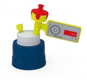 Perfectly matched system for removal of eluents. Tubing can be inserted onto the ground of the bottle by means of the b.safe fittings made of PFA. The conical seal cone clamps the tubing and seals the connection safely. The b.safe Air Valve is especially adapted to the flow rate in HPLC. The integrated non-return valve avoids evaporation of solvents and lets flow ambient air into the bottle in case of vacuum. The upstream porous PTFE membrane restrains pollutant particles and other contaminations from outside. The 6 months service life of the filter can be easily monitored through either activating the display on the cap and exchanging the valve in case of completely red colouring or documentation of the exchange date by hand and clip in the display at the valve.