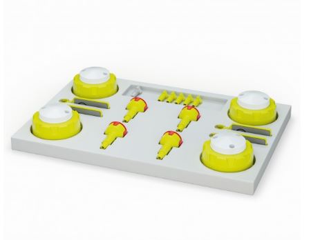 Starter Box A (GL 45) Scope of delivery: 3 ea. b.safe Caps GL 45 with 1 capillary connection, 1 ea. b.safe Cap GL 45 with 2 capillary connections, 4 ea. air valves with service life indicator, 5 ea. Fittings for tubing O.D. 3.2 mm (PFA-yellow, UNF 1/4), 1 ea. blindfitting (PFA, UNF 1/4").