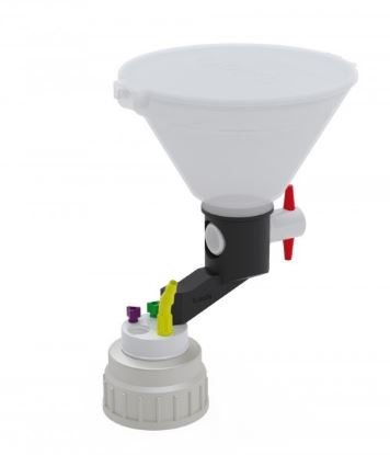 Waste Cap B53 with Funnel (2x UNF1/4, 1x GL14, 1x NPT1/8") Screw cap B53 made of PP, insert made of PTFE with 2 capillary connections (UNF 1/4), 1 connection for tubing I.D. 5.5-8.0 mm (NPT 1/8") and 1 connection for exhaust filter (GL 14, not included). Accessories: Fittings made of PFA (2x green for tubing O.D. 1,6 mm, 2x purple for tubing O.D 2,2 mm and 2x yellow for tubing O.D. 3,2 mm), 1 Blind Fitting (PFA, UNF 1/4"), 1 bent hose connector for tubing I. D. 5.5-8.0 mm (PP-yellow), 1x funnel with stopcock with grip (PE)