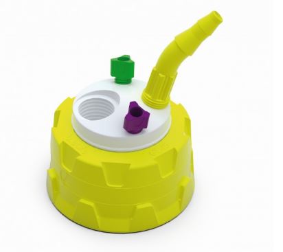 Waste Cap GL45 (2x UNF1/4, 1x GL14, 1x NPT1/8") Screw cap GL 45 made of PPS yellow, insert made of PTFE with 2 capillary connections (UNF 1/4), 1 connection for tubing I.D. 5.5-8.0 mm (NPT 1/8") and 1 connection for exhaust filter (GL14). Including fittings made of PFA (2x green for tubing O.D. 1,6 mm, 2x purple for tubing O.D. 2,2 mm, 2x yellow for tubing O.D. 3,2 mm), 1 blind fittings (PFA-milky-white), 1 hose connector for tubing I.D. 5.5-8.0 mm (PP-yellow).