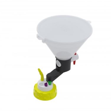 Waste Cap S55 with Funnel (2x UNF1/4, 1x GL14, 1x NPT1/8") Screw cap S55 made of PP, insert made of PTFE with 2 capillary Connections (UNF 1/4), 1 connection for tubing I.D. 5.5-8.0 mm (NPT 1/8") and 1 connection for exhaust filter (GL 14, not included). Accessories: Fittings made of PFA (2x green for tubing O.D. 1,6 mm, 2x purple for tubing O.D. 2,2 mm and 2x yellow for tubing O.D. 3,2 mm), 1 Blind Fitting (PFA, UNF 1/4"), 1 bent hose connector for tubing I. D. 5.5-8.0 mm (PP yellow), 1x funnel with stopcock with grip (PE).