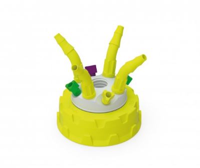 Waste Cap S55 (4x UNF1/4, 1x GL14, 4x NPT1/8") Screw cap S55 made of PP-yellow, insert made of PTFE with 4 capillary connections (UNF 1/4), 4 connections for tubing I.D. 5.5-8.0 mm (NPT 1/8") and 1 connection for exhaust filter (GL14). Including fittings made of PFA (4x green for tubing O.D. 1,6 mm, 4x purple for tubing O.D. 2,2 mm, 4x yellow for tubing O.D. 3,2 mm), 4 blind fittings UNF 1/4" (PFA-milky-white), 4 blind fittings NPT 1/8" (PTFE-white), 4 hose connectors for tubing I.D. 5.5-8.0 mm (PP-yellow).