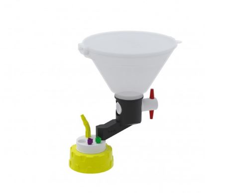 Waste Cap S60 with Funnel (2x UNF1/4, 1x GL14, 1x NPT1/8") Screw cap S60 made of PP, insert made of PTFE with 2 capillary connections (UNF 1/4), 1 connection for tubing I.D. 5.5-8.0 mm (NPT 1/8") and 1 connection for exhaust filter (GL 14, not included). Accessories: Fittings made of PFA (2x green for tubing O.D. 1,6 mm, 2x purple for tubing O.D. 2,2 mm and 2x yellow for tubing O.D. 3,2 mm), 1 Blind Fitting (PFA, UNF 1/4"), 1 bent hose connector for tubing I. D. 5.5-8.0 mm (PP yellow), 1x funnel with stopcock with grip (PE).