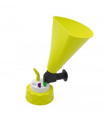 Waste Cap S60 with Funnel (2x UNF1/4, 1x GL14, 1x NPT1/8") Screw cap S60 made of PP, insert made of PTFE with 2 capillary connections (UNF 1/4), 1 connection for tubing I.D. 5.5-8.0 mm (NPT 1/8") and 1 connection for exhaust filter (GL 14, not included). Accessories: Fittings made of PFA (2x green for tubing O.D. 1,6 mm, 2x purple for tubing O.D. 2,2 mm and 2x yellow for tubing O.D. 3,2 mm), 1 Blind Fitting (PFA, UNF 1/4"), 1 bent hose connector for tubing I. D. 5.5-8.0 mm (PP yellow), 1x funnel with automatic stopcock (PP-yellow).