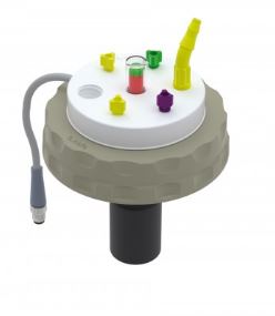 Waste Cap S90 Electronic Fill-Level Control (4x UNF1/4, 1x GL14, 1x NPT1/8") Cap S90 made of PE, insert made of PTFE with permanently mounted cable (approx. 400 mm), sight glass and indicator pin, 4 capillary connectors (UNF 1/4), 1 connector for tubing I. D. 5.5-8.0 mm (NPT 1/8"), 1 connector for Exhaust Filter (GL14, not included). Accessories: Fittings made of PFA (4x green for tubing O. D 1,6 mm, 4x purple for tubing O. D. 2,2 mm and 4x yellow for tubing O. D. 3,2 mm), 3 Blind Fittings(PFA), 1 bent hose connector for tubing I. D. 5.5-8.0 mm (PP yellow).