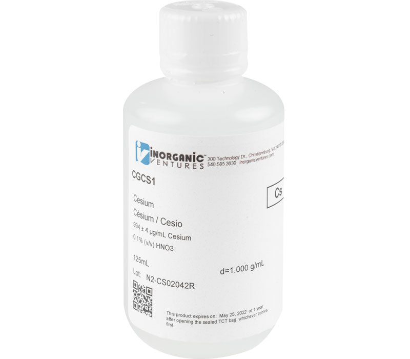 CesiumLocation: Group 1, Period 6 Storage & Handling: Keep tightly sealed when not in use. Store and use at 20 ± 4°C. Do not pipet from container. Do not return portions removed for pipetting to container. Chemical Compatibility: Soluble in dilute HCl, HNO3, H2SO4 and HF aqueous matrices. Stable with most metals and inorganic anions. Forms insoluble Cs2[PtCl6]. Stability: 2-100 ppb levels stable for months in 1% HNO3 / LDPE container. 1-10,000 ppm solutions chemically stable for years in 0.1% HNO3 / LDPE container. Will crystallize out of higher (~ 5%) levels of HNO3 at > 1000 µg/mL. Cs Containing Samples (Preparation & Solution): Metal (dissolves very rapidly in water); Ores (sodium carbonate fusion in Pt0 followed by HCl dissolution - blank levels of Cs in sodium carbonate critical); Organic Matrices (Sulphuric / peroxide digestion or nitric / Sulphuric / perchloric acid decomposition). |