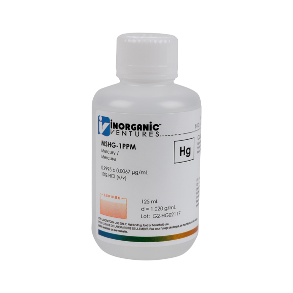 Location:  Group 12, Period 6  Storage & Handling: Keep tightly sealed when not in use. Store and use at 20 ± 4°C. Do not pipet from container. Do not return portions removed for pipetting to container. Chemical Compatibility: Stable in HNO3. Avoid basic media forming insoluble carbonate. The sulfide, basic carbonate, oxalate, phosphate, arsenite, arsenate, and iodide are insoluble in water. Stability: 2-100 ppb levels - stable in 10% HNO3 packaged in borosilicate glass; NOT stable in 1% HNO3 / LDPE container. 1-100 ppm levels stable in 7% HNO3 packaged in borosilicate glass. 1000-10,000 ppm solutions are chemically stable for years in 5-10% HNO3 / LDPE container. Hg Containing Samples (Preparation & Solution): Metal (soluble in HNO3); HgO (soluble in HNO3); Ores and Organic based (our documentation has more references to the preparation of Hg containing samples than any other element -- because these preparations are prone to error, we recommend you contact our technical staff at ivtech@ivstandards.com or (800) 569-6799 and we'll provide you with the necessary data for your specific sample type).  |