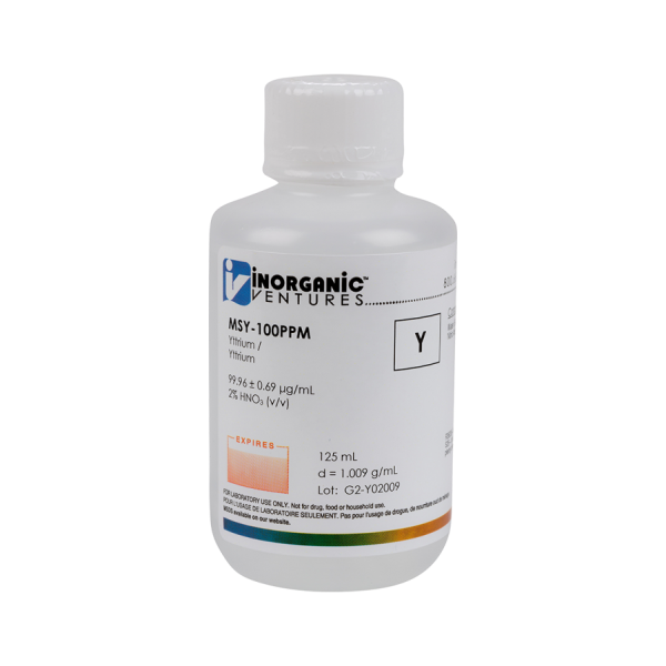 YttriumLocation: Group 3, Period 5 Storage & Handling: Keep tightly sealed when not in use. Store and use at 20 ± 4°C. Do not pipet from container. Do not return portions removed for pipetting to container. Chemical Compatibility: Soluble in HCl, H2SO4, and HNO3. Avoid HF, H3PO4, and neutral to basic media. Stable with most metals and inorganic anions forming an insoluble carbonate, oxide, oxalate, and fluoride. Avoid mixing with elements / solutions containing moderate amounts of fluoride. Stability: 2-100 ppb levels stable for months in 1% HNO3 / LDPE container. 1-10,000 ppm solutions chemically stable for years in 2-5% HNO3 / LDPE container. Y Containing Samples (Preparation & Solution): Metal (soluble in acids); Oxide (dissolved by heating in H2O / HNO3); Ores (carbonate fusion in Pt0 followed by HCl dissolution); Organic Matrices (dry ash and dissolve in 1:1 H2O / HCl or HNO3). |