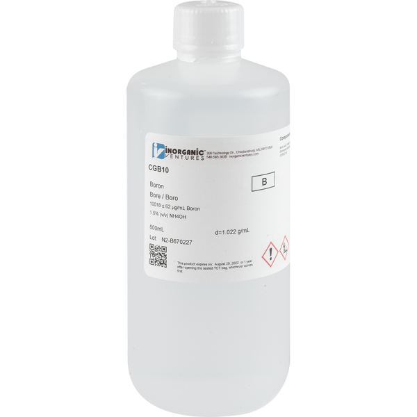 BoronLocation: Group 13, Period 2 Storage & Handling: Keep tightly sealed when not in use. Store and use at 20 ± 4°C. Do not pipet from container. Do not return portions removed for pipetting to container. Chemical Compatibility: Moderately soluble in HCl, HNO3, H2SO4 and HF aqueous matrices and very soluble in NH4OH. Stable with all metals and inorganic anions at low to moderate ppm levels. Stability: 2-100 ppb levels stable for months in 1% HNO3 / LDPE container. 1-1,000 ppm solutions chemically stable for years in 1% HNO3 / LDPE container. 1000-10,000 ppm stable for years in dilute NH4OH / LDPE container. B Containing Samples (Preparation & Solution): Metal (crystalline form is scarcely attacked by acids or alkaline solutions; amorphous form is soluble in conc. HNO3 or H2SO4); B(OH)3 (water soluble); Ores (avoid acid digestions and use caustic fusions in Pt0); Organic Matrices (dry ash mixed with Na2CO3 in Pt0 at 450°C then increase heat to 1000°C to fuse; or perform a Na2O2 fusion in a Ni0 crucible / Parr bomb). |