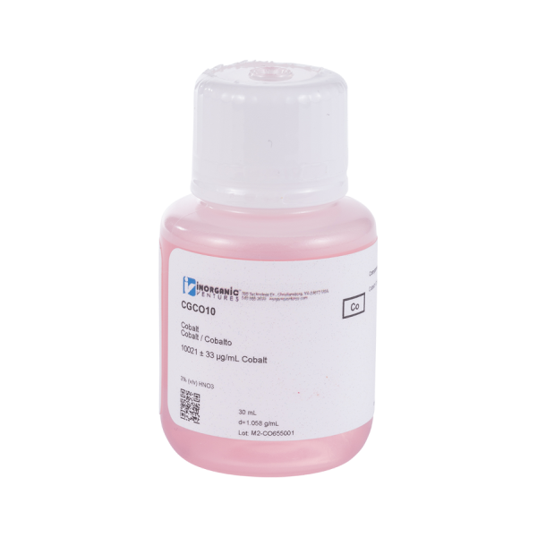 CobaltLocation: Group 9, Period 4 Storage & Handling: Keep tightly sealed when not in use. Store and use at 20 ± 4°C. Do not pipet from container. Do not return portions removed for pipetting to container. Chemical Compatibility: Stable in HCl, HNO3, H2SO4, HF and H3PO4. Avoid basic media. Stable with most metals and inorganic anions in acidic media. Stability: 2-100 ppb levels stable for months in 1% HNO3 / LDPE container. 1-10,000 ppm solutions chemically stable for years in 1-5% HNO3 / LDPE container. Co Containing Samples (Preparation & Solution): Metal (soluble in HNO3); Oxides (soluble in HCl); Ores (dissolve in HCl / HNO3). |