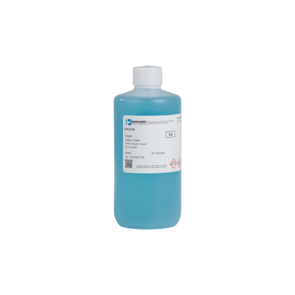 CopperLocation: Group 11, Period 4 Storage & Handling: Keep tightly sealed when not in use. Store and use at 20 ± 4°C. Do not pipet from container. Do not return portions removed for pipetting to container. Chemical Compatibility: Stable in HCl, HNO3, H2SO4, HF, H3PO4. Avoid basic media. Stable with most metals and inorganic anions in acidic media. Stability: 2-100 ppb levels stable for months in 1% HNO3 / LDPE container. 1-10,000 ppm solutions chemically stable for years in 1-5% HNO3 / LDPE container. Cu Containing Samples (Preparation & Solution): Metal (soluble in HNO3); Oxides (soluble in HCl); Ores (dissolve in HCl / HNO3). |