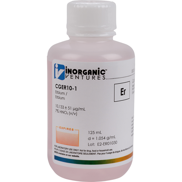ErbiumLocation: Period 6 (lanthanoid) Storage & Handling: Keep tightly sealed when not in use. Store and use at 20 ± 4°C. Do not pipet from container. Do not return portions removed for pipetting to container. Chemical Compatibility: Soluble in HCl, H2SO4, and HNO3. Avoid HF, H3PO4, and neutral to basic media. Stable with most metals and inorganic anions forming an insoluble carbonate, oxide, oxalate, and fluoride. Avoid mixing with elements / solutions containing moderate amounts of fluoride. Stability: 2-100 ppb levels stable for months in 1% HNO3 / LDPE container. 1-10,000 ppm solutions chemically stable for years in 2-5% HNO3 / LDPE container. Er Containing Samples (Preparation & Solution): Metal (soluble in acids); Oxide (dissolved by heating in H2O/ HNO3); Ores (carbonate fusion in Pt0 followed by HCl dissolution); Organic Matrices (dry ash and dissolve in 1:1 H2O / HCl or HNO3). |