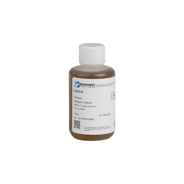 HolmiumLocation: Period 6 (lanthanoid) Storage & Handling: Keep tightly sealed when not in use. Store and use at 20 ± 4°C. Do not pipet from container. Do not return portions removed for pipetting to container. Chemical Compatibility: Soluble in HCl, H2SO4, and HNO3. Avoid HF, H3PO4, and neutral to basic media. Stable with most metals and inorganic anions forming an insoluble carbonate, oxide, oxalate, and fluoride. Avoid mixing with elements / solutions containing moderate amounts of fluoride. Stability: 2-100 ppb levels stable for months in 1% HNO3 / LDPE container. 1-10,000 ppm solutions chemically stable for years in 2-5% HNO3 / LDPE container. Ho Containing Samples (Preparation & Solution): Metal (soluble in acids); Oxide (dissolved by heating in H2O / HNO3); Ores (carbonate fusion in Pt0 followed by HCl dissolution); Organic Matrices (dry ash and dissolve in 1:1 H2O / HCl or HNO3). |