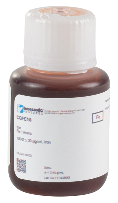 IronLocation: Group 8, Period 4 Storage & Handling: Keep tightly sealed when not in use. Store and use at 20 ± 4°C. Do not pipet from container. Do not return portions removed for pipetting to container. Chemical Compatibility: Stable in HCl, HNO3, H2SO4, HF, H3PO4. Avoid basic media. Stable with most metals and inorganic anions in acidic media. Stability: 2-100 ppb levels stable for months in 1% HNO3 / LDPE container. 1-10,000 ppm solutions chemically stable for years in 1-5% HNO3 / LDPE container. Fe Containing Samples (Preparation & Solution): Metal (soluble in HCl); Oxides (if the oxide has been at a high temperature then Na2CO3 fusion in Pt0 followed by HCl dissolution, otherwise dissolve in dilute HCl); Ores (see Oxides above using only the fusion approach). |