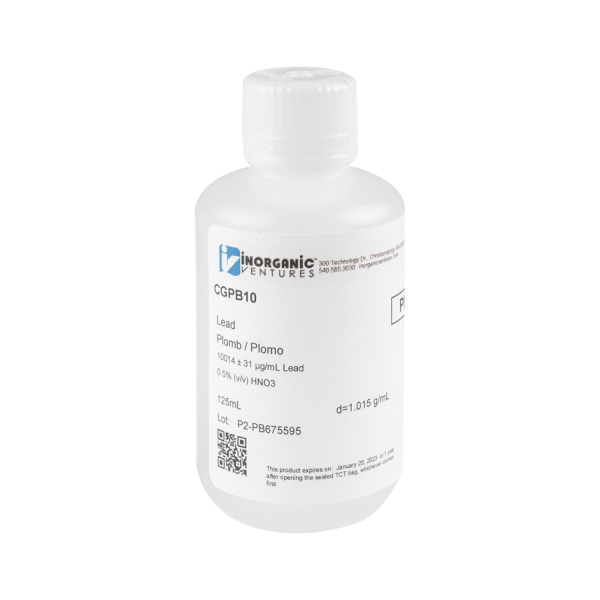 LeadLocation: Group 14, Period 6 Storage & Handling: Keep tightly sealed when not in use. Store and use at 20 ± 4°C. Do not pipet from container. Do not return portions removed for pipetting to container. Chemical Compatibility: Soluble in HCl, HF, and HNO3. Avoid H2SO4. Stable with most metals and inorganic anions forming insoluble carbonate, borate, sulfate, sulfite, sulfide, phosphate, oxalate, chromate, tannate, iodate, and cyanide in neutral aqueous media. Stability: 2-100 ppb levels stable for months in 1% HNO3 / LDPE container. 1-10,000 ppm solutions chemically stable for years in 2-5% HNO3 / LDPE container. Pb Containing Samples (Preparation & Solution): Metal (best dissolved in 1:1 H2O / HNO3); Oxides (the many different Pb oxides are soluble in HNO3, with the exception of PbO2 which is soluble in HCl or HF); Ores and Alloys (best attacked using 1:1 H2O / HNO3); Organic Matrices (dry ash and dissolve in dilute HCl. Do not heat when dissolving to avoid precipitation of SiO2). |