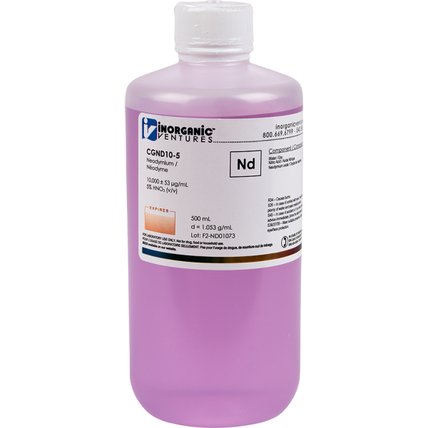NeodymiumLocation: Period 6 (lanthanoid) Storage & Handling: Keep tightly sealed when not in use. Store and use at 20 ± 4°C. Do not pipet from container. Do not return portions removed for pipetting to container. Chemical Compatibility: Soluble in HCl and HNO3. Avoid HF, H3PO4, H2SO4 and neutral to basic media. Stable with most metals and inorganic anions forming an insoluble carbonate, oxide, oxalate, and fluoride and sparingly soluble sulfates (La - Eu exhibit low sulfate solubility). Avoid mixing with elements / solutions containing moderate amounts of fluoride. Stability: 2-100 ppb levels stable for months in 1% HNO3 / LDPE container. 1-10,000 ppm solutions chemically stable for years in 2-5% HNO3 / LDPE container. Nd Containing Samples (Preparation & Solution): Metal (soluble in acids); Oxide (dissolved by heating in H2O / HNO3); Ores (carbonate fusion in Pt0 followed by HCl dissolution); Organic Matrices (dry ash and dissolve in 1:1 H2O / HCl or HNO3). |