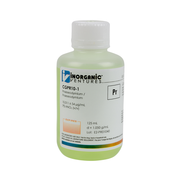 PraeseodymiumLocation: Period 6 (lanthanoid) Storage & Handling: Keep tightly sealed when not in use. Store and use at 20 ± 4°C. Do not pipet from container. Do not return portions removed for pipetting to container. Chemical Compatibility: Soluble in HCl and HNO3. Avoid HF, H3PO4, H2SO4, and neutral to basic media. Stable with most metals and inorganic anions forming an insoluble carbonate, oxide, oxalate, and fluoride and sparingly soluble sulfates (La - Eu exhibit low sulfate solubility). Avoid mixing with elements / solutions containing moderate amounts of fluoride. Stability: 2-100 ppb levels stable for months in 1% HNO3 / LDPE container. 1-10,000 ppm solutions chemically stable for years in 2-5% HNO3 / LDPE container. Pr Containing Samples (Preparation & Solution): Metal (soluble in acids); Oxide (dissolved by heating in H2O / HNO3); Ores (carbonate fusion in Pt0 followed by HCl dissolution); Organic Matrices (dry ash and dissolve in 1:1 H2O / HCl or HNO3). |