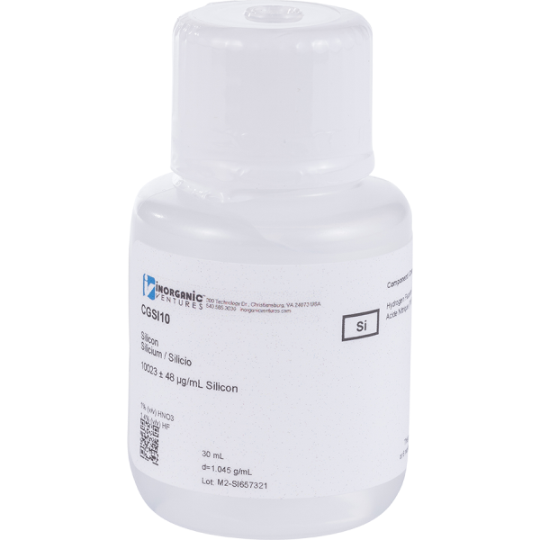 SiliconLocation: Group 14, Period 3 Storage & Handling: Keep tightly sealed when not in use. Store and use at 20 ± 4°C. Do not pipet from container. Do not return portions removed for pipetting to container. Chemical Compatibility: Soluble in HCl, HF, H3PO4, H2SO4, and HNO3 as the Si(OH)x(F)y2-. Avoid neutral to basic media. Unstable at ppm levels with metals that would pull F- away (i.e. - do not mix with Alkaline or Rare Earths, or high levels of transition elements unless they are fluorinated). Stable with most inorganic anions with a tendency to hydrolyze forming silicic acid (silicic acid is soluble up to ~ 100 ppm in water) in all dilute acids except HF. Stability: 2-100 ppb levels - stability unknown - (alone or mixed with all other metals) as the Si(OH)x(F)y2-. 1-10,000 ppm single element solutions as the Si(OH)x(F)y2- chemically stable for years in 2-5% HNO3 / trace HF in a LDPE container. Si Containing Samples (Preparation & Solution): Metal (soluble in 1:1:1 H2O / HF / HNO3); Oxide - SiO2, amorphic (dissolve by heating in 1:1:1 H2O / HF / HNO3); Oxide-quartz (fuse in Pt0 with Na2CO3); Geological Samples (fuse in Pt0 with Na2CO3 followed by HCl solution of the fuseate); Organic Matrices containing silicates and non volatile silicon compounds (dry ash at 450°C in Pt0 and dissolve by gently warming with 1:1:1 H2O / HF / H2SO4 or fuse / ash with Na2CO3 and dissolve fuseate with HCl / H2O); Silicone Oils - dimethyl silicones depolymerize to form volatile monomer units when heated (measure directly in alcoholic KOH / xylene mixture where sample is treated first with the KOH at 60 - 100°C to "unzip" the Si-O-Si polymeric structure or digest with conc. H2SO4 / H2O2 followed by cooling and dissolution of the dehydrated silica with HF). Note that the direct analysis of silicone oils in an organic solvent will result in false high results due to high vapor pressure of volatile monomer units such as hexamethylcyclotrisiloxane. The KOH forms the K2+Si(CH3)2O=NaCl, which is not volatile at room temperature. |