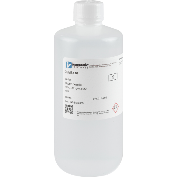 SulfurLocation: Group 16, Period 3 Storage & Handling: Keep tightly sealed when not in use. Store and use at 20 ± 4°C. Do not pipet from container. Do not return portions removed for pipetting to container. Chemical Compatibility: Soluble in HCl, HNO3, H3PO4, and HF aqueous matrices, water, and NH4OH. Stable with all metals and inorganic anions at low to moderate ppm levels under acidic conditions, except Ba, Pb, Ca, and to a lesser extent Sr. Stability: 2-100 ppb levels - stability unknown - in 1% HNO3 / LDPE container. 1-10,000 ppm solutions chemically stable for years in LDPE container. S Containing Samples (Preparation & Solution): We most often get questions about the determination of S in rocks, silicates and insoluble sulfates (the finely powered sample is fused in a Pt0 crucible with 6 times its weight of Na2CO3 + 0.5 grams KNO3. The fuseate is extracted with water. Any BaSO4 present in the sample is transposed by the carbonate fusion to the BaCO3, which is left behind in the water-insoluble residue. If PbSO4 is present, the fuseate should be boiled with a sodium carbonate saturated with CO2 solution for 1 hour or more. The PbSO4 will be transposed to the water insoluble carbonate which can be filtered off. Boiling the fuseate with a saturated carbonate solution is good insurance for samples containing Ba, Sr, and Ca. The Ba, Pb, Sr, and Ca free filtrate can be acidified and measured by ICP). |
