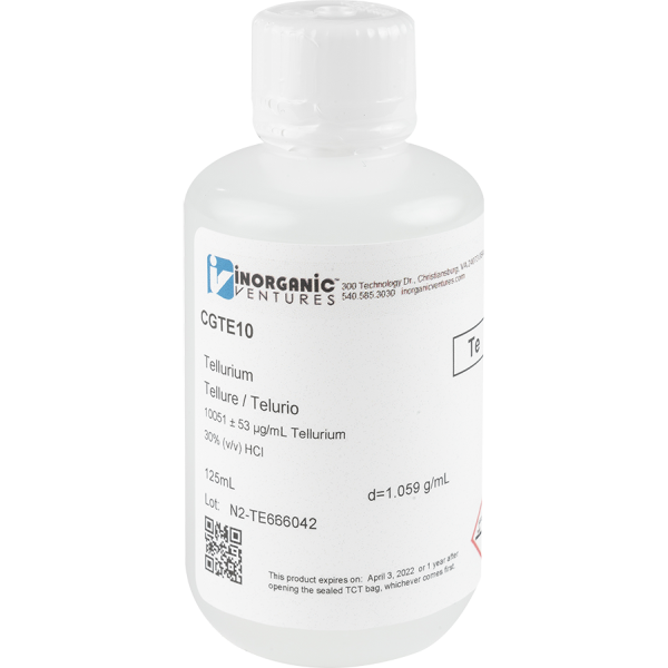 TelluriumLocation: Group 16, Period 5 Storage & Handling: Keep tightly sealed when not in use. Store and use at 20 ± 4°C. Do not pipet from container. Do not return portions removed for pipetting to container. Chemical Compatibility: Soluble in HCl, HNO3, H3PO4, H2SO4 and HF aqueous matrices and water. It is stable with most inorganic anions and cations. Avoid mixing HCl matrices with elements forming insoluble chlorides such as Ag+. When fluorinated and/or under acidic conditions precipitation is typically not a problem at moderate to low concentrations. Stability: 2-100 ppb levels stable for months alone or mixed with other elements at equivalent levels in 1% HNO3 / LDPE container. 1-10,000 ppm solutions chemically stable for years in 1-5% HNO3 / LDPE container. Te Containing Samples (Preparation & Solution): Metal (soluble in solutions of alkali hydroxides or a 1:1:1 mixture of H2O, H2SO4, HNO3); Oxides (TeO2 is soluble in HCl and the alkali hydroxides. TeO3is soluble in hot concentrated solutions of the alkali hydroxides.); Minerals and alloys (acid digestion with HNO3or HNO3 / HF); Organic Matrices (Vegetable Matter - dry ash 100 g of the well-ground and mixed vegetation into a concentrated solution of 25 g of magnesium nitrate and magnesium oxide. Dry, ignite and muffle until the ash is a uniform gray color). |