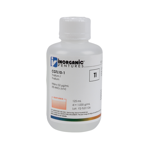ThalliumLocation: Group 13, Period 6 Storage & Handling: Keep tightly sealed when not in use. Store and use at 20 ± 4°C. Do not pipet from container. Do not return portions removed for pipetting to container. Chemical Compatibility: Soluble in HCl, HNO3, and H2SO4. Stable with most metals and inorganic anions. The sulfite, thiocyanate, and oxalate are moderately soluble; the phosphate and arsenite are slightly soluble and the sulfide is insoluble. Stability: 2-100 ppb levels stable for months in 1% HNO3 / LDPE container. 1-10,000 ppm solutions chemically stable for years in 2-5% HNO3 / LDPE container. Tl Containing Samples (Preparation & Solution): Metal (is best dissolved in HNO3 which forms chiefly the Tl1+ ion); Oxide (the thallous oxide is readily soluble in water. The thallic oxide requires high levels of acid); Ores (carbonate fusion in Pt0 followed by HCl dissolution); Organic Matrices (Sulphuric / peroxide digestion or dry ash and dissolution in HCl). |