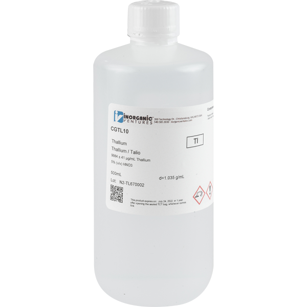 ThalliumLocation: Group 13, Period 6 Storage & Handling: Keep tightly sealed when not in use. Store and use at 20 ± 4°C. Do not pipet from container. Do not return portions removed for pipetting to container. Chemical Compatibility: Soluble in HCl, HNO3, and H2SO4. Stable with most metals and inorganic anions. The sulfite, thiocyanate, and oxalate are moderately soluble; the phosphate and arsenite are slightly soluble and the sulfide is insoluble. Stability: 2-100 ppb levels stable for months in 1% HNO3 / LDPE container. 1-10,000 ppm solutions chemically stable for years in 2-5% HNO3 / LDPE container. Tl Containing Samples (Preparation & Solution): Metal (is best dissolved in HNO3 which forms chiefly the Tl1+ ion); Oxide (the thallous oxide is readily soluble in water. The thallic oxide requires high levels of acid); Ores (carbonate fusion in Pt0 followed by HCl dissolution); Organic Matrices (Sulphuric / peroxide digestion or dry ash and dissolution in HCl). |
