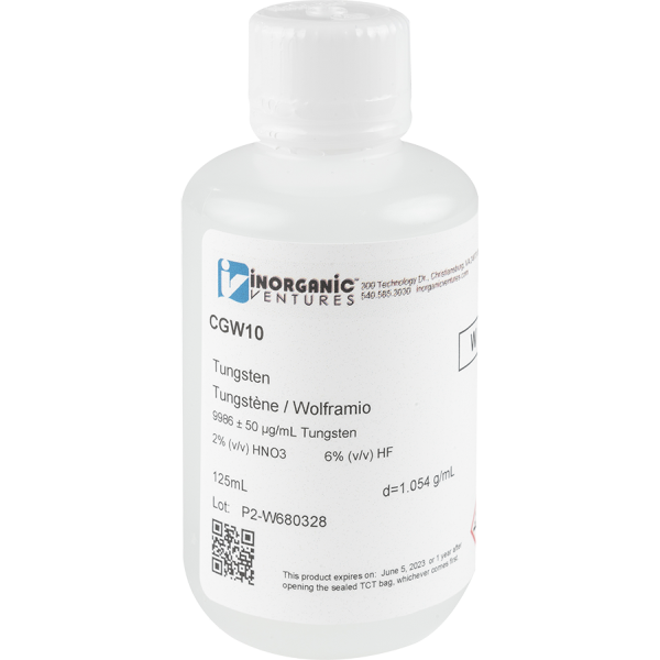 TungstenLocation: Group 6, Period 6 Storage & Handling: Keep tightly sealed when not in use. Store and use at 20 ± 4°C. Do not pipet from container. Do not return portions removed for pipetting to container. Chemical Compatibility: W is very readily hydrolyzed requiring 0.1 to 1% HF for stable acidic solutions. The [WOF5]-2 is soluble in % levels of HCl and HNO3, provided it is in the [WOF5]-2 form. Stable at ppm levels with some metals provided it is fluorinated. Do not mix with Alkaline or Rare Earths. W is best to be mixed only with other fluorinated metals (Ti, Zr, Hf, Nb, Ta, Mo, Si, Sn, Ge). Look for yellow WO3 precipitate if mixed with other transitions at higher levels indicating instability. The yellow WO3 will form over a period of weeks even in trace HF, therefore HF levels of W multi-element blends should be ~ 1%. Stability: 2-100 ppb levels stable (alone or mixed with all other metals that are at comparable levels) as the [WOF5]-2 for months in 1% HNO3 / LDPE container. 1-10,000 ppm single element solutions as the [WOF5]-2 chemically stable for years in 1% HF in a LDPE container. W Containing Samples (Preparation & Solution): Metal (soluble in HF / HNO3); Oxide (soluble in HF or NH4OH); Organic Matrices (dry ash at 450 0C in Pt0 and dissolve oxide with HF). |