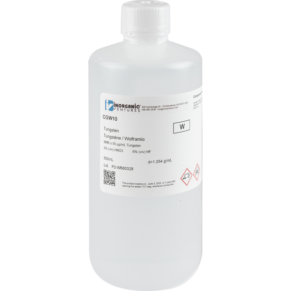 TungstenLocation: Group 6, Period 6 Storage & Handling: Keep tightly sealed when not in use. Store and use at 20 ± 4°C. Do not pipet from container. Do not return portions removed for pipetting to container. Chemical Compatibility: W is very readily hydrolyzed requiring 0.1 to 1% HF for stable acidic solutions. The [WOF5]-2 is soluble in % levels of HCl and HNO3, provided it is in the [WOF5]-2 form. Stable at ppm levels with some metals provided it is fluorinated. Do not mix with Alkaline or Rare Earths. W is best to be mixed only with other fluorinated metals (Ti, Zr, Hf, Nb, Ta, Mo, Si, Sn, Ge). Look for yellow WO3 precipitate if mixed with other transitions at higher levels indicating instability. The yellow WO3 will form over a period of weeks even in trace HF, therefore HF levels of W multi-element blends should be ~ 1%. Stability: 2-100 ppb levels stable (alone or mixed with all other metals that are at comparable levels) as the [WOF5]-2 for months in 1% HNO3 / LDPE container. 1-10,000 ppm single element solutions as the [WOF5]-2 chemically stable for years in 1% HF in a LDPE container. W Containing Samples (Preparation & Solution): Metal (soluble in HF / HNO3); Oxide (soluble in HF or NH4OH); Organic Matrices (dry ash at 450 0C in Pt0 and dissolve oxide with HF). |