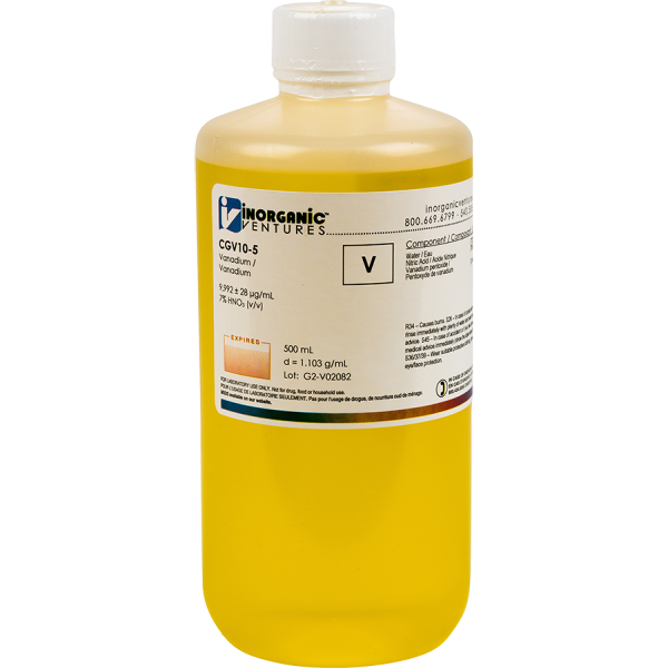 VanadiumLocation: Group 5, Period 4 Storage & Handling: Keep tightly sealed when not in use. Store and use at 20 ± 4°C. Do not pipet from container. Do not return portions removed for pipetting to container. Chemical Compatibility: Soluble in HCl, HNO3, H2SO4, HF, H3PO4, and strong basic media. Stable with most metals and inorganic anions in acidic media. Stability: 2-100 ppb levels stable for months in 1% HNO3 / LDPE container. 1-10,000 ppm solutions chemically stable for years in 1-5% HNO3 / LDPE container. V Containing Samples (Preparation & Solution): Metal (fusion with NaOH or KOH in Ni0 or Na2CO3 / KNO3); Oxides (V2O3 - use HCl; V2O4 - use HCl or HNO3; V2O5 - use conc. acids); Ores (Na2CO3 / KNO3 in Pt0 (caution - nitrates attack Pto) followed by water extraction of fuseate); Organic Matrices (ash at 450°C followed by dissolving according to V2O5 above). |