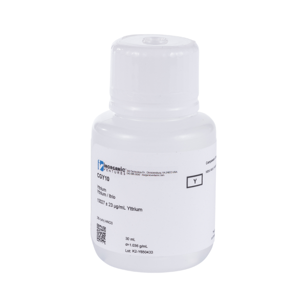 YttriumLocation: Group 3, Period 5 Storage & Handling: Keep tightly sealed when not in use. Store and use at 20 ± 4°C. Do not pipet from container. Do not return portions removed for pipetting to container. Chemical Compatibility: Soluble in HCl, H2SO4, and HNO3. Avoid HF, H3PO4, and neutral to basic media. Stable with most metals and inorganic anions forming an insoluble carbonate, oxide, oxalate, and fluoride. Avoid mixing with elements / solutions containing moderate amounts of fluoride. Stability: 2-100 ppb levels stable for months in 1% HNO3 / LDPE container. 1-10,000 ppm solutions chemically stable for years in 2-5% HNO3 / LDPE container. Y Containing Samples (Preparation & Solution): Metal (soluble in acids); Oxide (dissolved by heating in H2O / HNO3); Ores (carbonate fusion in Pt0 followed by HCl dissolution); Organic Matrices (dry ash and dissolve in 1:1 H2O / HCl or HNO3). |
