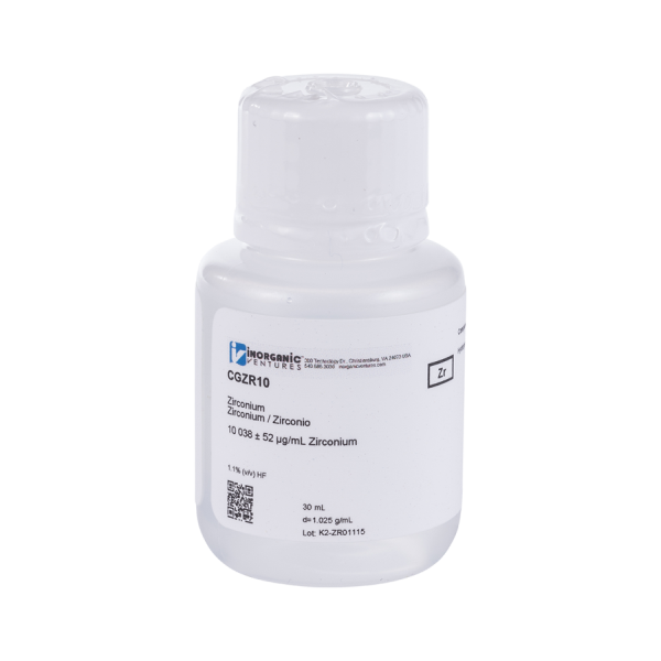 ZirconiumLocation: Group 4, Period 5 Storage & Handling: Keep tightly sealed when not in use. Store and use at 20 ± 4°C. Do not pipet from container. Do not return portions removed for pipetting to container. Chemical Compatibility: Soluble in concentrated HCl, HF, H2SO4 (very hot) and HNO3. Avoid H3PO4 and neutral to basic media. Unstable at ppm levels with metals that would pull F- away (i.e. - do not mix with Alkaline or Rare Earths or high levels of transition elements unless they are fluorinated). Stable with most inorganic anions but precipitation with phosphate, oxalate, and tartrate with a tendency to hydrolyze forming the hydrated oxide in all dilute acids except HF. Stability: 2-100 ppb levels stable (alone or mixed with all other metals that are at comparable levels) as the Zr(F)6-2 + Zr(OH)4F2-2 for months in 1% HNO3 / LDPE container. 1-10,000 ppm single element solutions as the Zr(F)6-2 chemically stable for years in 2-5% HNO3 / trace HF in an LDPE container. Zr Containing Samples (Preparation & Solution): Metal (soluble in H2O / HF / HNO3); Oxide unlike TiO2, the ZrO2 is best fused in one of the following ways (Na2O2 in Ni0, Na2CO3 in Pt0 or Borax in Pt0); Organic Matrices (dry ash at 450°C in Pt0 and dissolve by fusing with Na2CO3 and dissolving in HF / HNO3 / H2O). |