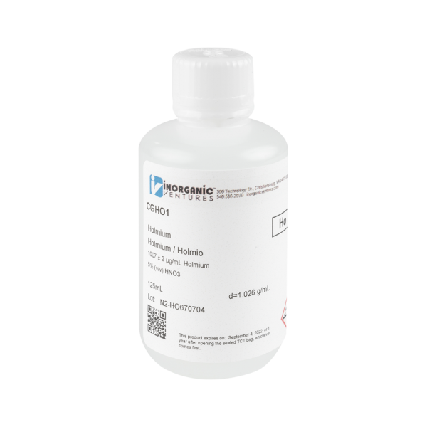 HolmiumLocation: Period 6 (lanthanoid) Storage & Handling: Keep tightly sealed when not in use. Store and use at 20 ± 4°C. Do not pipet from container. Do not return portions removed for pipetting to container. Chemical Compatibility: Soluble in HCl, H2SO4, and HNO3. Avoid HF, H3PO4, and neutral to basic media. Stable with most metals and inorganic anions forming an insoluble carbonate, oxide, oxalate, and fluoride. Avoid mixing with elements / solutions containing moderate amounts of fluoride. Stability: 2-100 ppb levels stable for months in 1% HNO3 / LDPE container. 1-10,000 ppm solutions chemically stable for years in 2-5% HNO3 / LDPE container. Ho Containing Samples (Preparation & Solution): Metal (soluble in acids); Oxide (dissolved by heating in H2O / HNO3); Ores (carbonate fusion in Pt0 followed by HCl dissolution); Organic Matrices (dry ash and dissolve in 1:1 H2O / HCl or HNO3). |