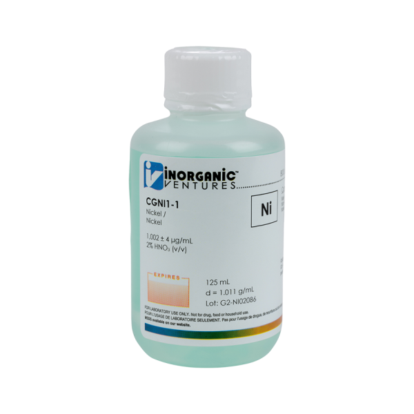 NickelLocation:  Group 10, Period 4  Storage & Handling: Keep tightly sealed when not in use. Store and use at 20 ± 4°C. Do not pipet from container. Do not return portions removed for pipetting to container. Chemical Compatibility: Stable in HCl, HNO3, H2SO4, HF, and H3PO4. Avoid basic media. Stable with most metals and inorganic anions in acidic media. Stability: 2-100 ppb levels. 2-100 ppb levels stable for months in 1% HNO3 / LDPE container. 1-10,000 ppm solutions chemically stable for years in 1-5% HNO3 / LDPE container. Ni Containing Samples (Preparation & Solution): Metal (soluble in HNO3); Oxides (soluble in HCl); Ores (dissolve in HCl / HNO3).  |