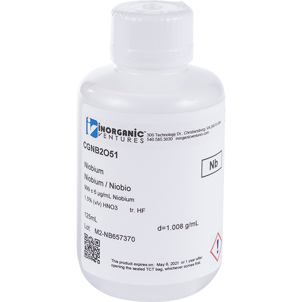 Location:  Group 5, Period 5  Storage & Handling: Keep tightly sealed when not in use. Store and use at 20 ± 4°C. Do not pipet from container. Do not return portions removed for pipetting to container. Chemical Compatibility: Soluble in concentrated HCl and dilute HF / HNO3. Avoid neutral to basic media. Unstable at ppm levels with metals that would pull F- away (i.e. - Do not mix with Alkaline or Rare Earths or high levels of transition elements unless they are fluorinated). Stable with most inorganic anions provided it is in the chemical form shown above. Stability: 2-100 ppb levels stable (alone or mixed with all other metals that are at comparable levels) as the NbOF5-2 for 5 months in 1% HNO3 / LDPE container. 1-10,000 ppm single element solutions as the NbOF5-2 chemically stable for years in 2-5% HNO3 / trace HF in an LDPE container. Nb Containing Samples (Preparation & Solution): Metal (soluble in HF / HNO3); Oxide - very resistant to all acids including HF (fusion with K2S2O7, KOH, or Na2CO3); Organic Matrices (dry ash at 450°C in Pt0 and dissolve by fusing with Na2CO3 or K2S2O7).  |