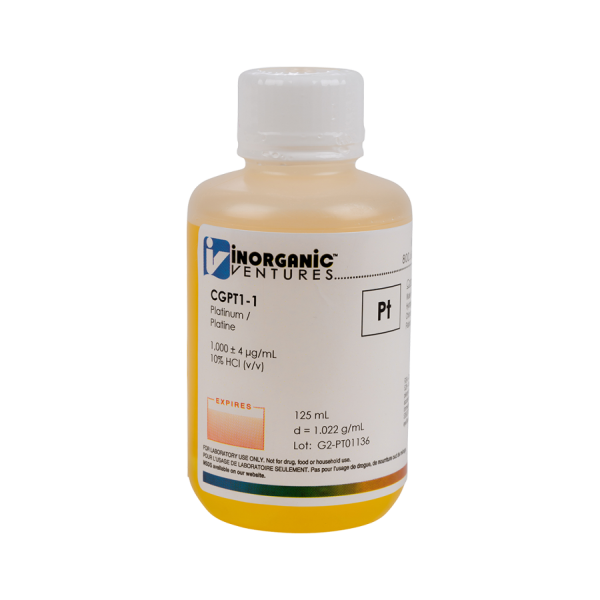 Location:  Group 10, Period 6  Storage & Handling: Keep tightly sealed when not in use. Store and use at 20 ± 4°C. Do not pipet from container. Do not return portions removed for pipetting to container. Chemical Compatibility: Stable in HCl and HNO3, as the chloride complex. Avoid basic media. Stable with most metals and inorganic anions in acidic media. Stability: 2-10 ppb Pt is stable for 2 months in 1% HNO3 / LDPE container. 100 ppb is stable for 5 months in 1% HNO3 / LDPE container. 1-10,000 ppm solutions chemically stable for years in 10 % HCl / LDPE container. Pt Containing Samples (Preparation & Solution): Metal (aqua regia); Oxides (soluble in HCl); Ores (dissolve in HCl / HNO3).  |
