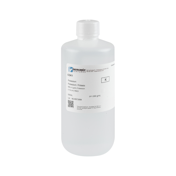 PotassiumLocation:  Group 1, Period 4  Storage & Handling: Keep tightly sealed when not in use. Store and use at 20 ± 4°C. Do not pipet from container. Do not return portions removed for pipetting to container. Chemical Compatibility: Soluble in HCl, HNO3, H2SO4, and HF aqueous matrices. Avoid use of HClO4 due to insolubility of the perchlorate. Stable with all metals and inorganic anions except ClO4-. Stability: 2-100 ppb levels stable for months in 1% HNO3 / LDPE container. 1-10,000 ppm solutions chemically stable for years in 1-5% HNO3 / LDPE container. K Containing Samples (Preparation & Solution): Metal (dissolves very rapidly in water); Ores (sodium carbonate fusion in Pt0 followed by HCl dissolution - blank levels of K in sodium carbonate critical); Organic Matrices (Sulphuric / peroxide digestion).  |