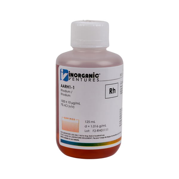 RhodiumLocation: Group 9, Period 5 Storage & Handling: Keep tightly sealed when not in use. Store and use at 20 ± 4°C. Do not pipet from container. Do not return portions removed for pipetting to container. Chemical Compatibility: Soluble in HCl, HNO3, H2SO4 and HF aqueous matrices. May cause AgCl precipitation when mixed with Ag+. Stable with all other metals. Stability: 2-100 ppb levels stable for months in 1% HNO3 / LDPE container. 1-10,000 ppm solutions chemically stable for years in 10% HCl/LDPE container. Rh Containing Samples (Preparation & Solution): Metal (elevated temp. with aqua regia or HCl / Cl2(gas) ); Ores (HF / H2SO4 digestion followed by aqua regia digestion); Platinum Scrap (aqua regia digestion). |