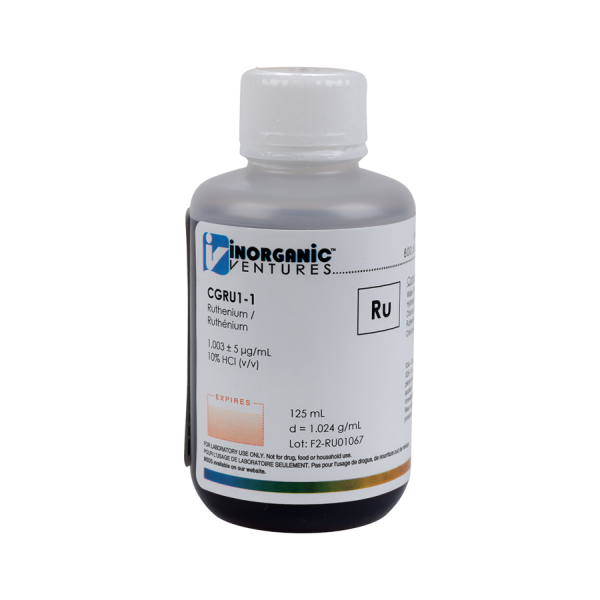 RutheniumLocation: Group 8, Period 5 Storage & Handling: Keep tightly sealed when not in use. Store and use at 20 ± 4°C. Do not pipet from container. Do not return portions removed for pipetting to container. Chemical Compatibility: Stable in HCl. Stable with most metals and inorganic anions as the [RuCl6]2- in dilute acidic media. Stability: 2-100 ppb levels stable for months in 1% HNO3 / LDPE container. 1-10,000 ppm solutions chemically stable for years in 10% HCl / LDPE container. Ru Containing Samples (Preparation & Solution): Metal (fuse with KOH/KNO3 in a Ag0 crucible); Oxides (fuse with KOH / KNO3 in a Ag0 crucible); Ores (see Oxides); Alloys (see Oxides). Organics (the RuO4 is volatile and acidic oxidizing preparations should be used with caution. The preferred approach is the KOH / KNO3 fusion and dissolution of the fuseate in HCl). |