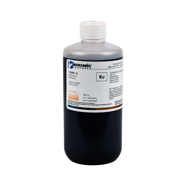 RutheniumLocation: Group 8, Period 5 Storage & Handling: Keep tightly sealed when not in use. Store and use at 20 ± 4°C. Do not pipet from container. Do not return portions removed for pipetting to container. Chemical Compatibility: Stable in HCl. Stable with most metals and inorganic anions as the [RuCl6]2- in dilute acidic media. Stability: 2-100 ppb levels stable for months in 1% HNO3 / LDPE container. 1-10,000 ppm solutions chemically stable for years in 10% HCl / LDPE container. Ru Containing Samples (Preparation & Solution): Metal (fuse with KOH/KNO3 in a Ag0 crucible); Oxides (fuse with KOH / KNO3 in a Ag0 crucible); Ores (see Oxides); Alloys (see Oxides). Organics (the RuO4 is volatile and acidic oxidizing preparations should be used with caution. The preferred approach is the KOH / KNO3 fusion and dissolution of the fuseate in HCl). |